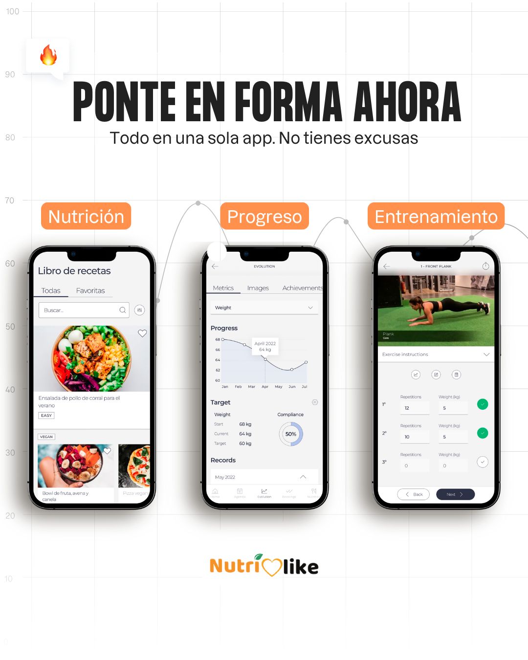 Acceso a una app personalizada para hacer intercambios de recetas ajustadas a nivel calórico y de macronutrientes, lista de la compra, evolución de tu progreso y recomendaciones.